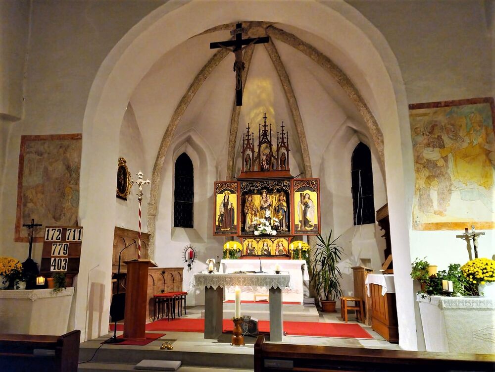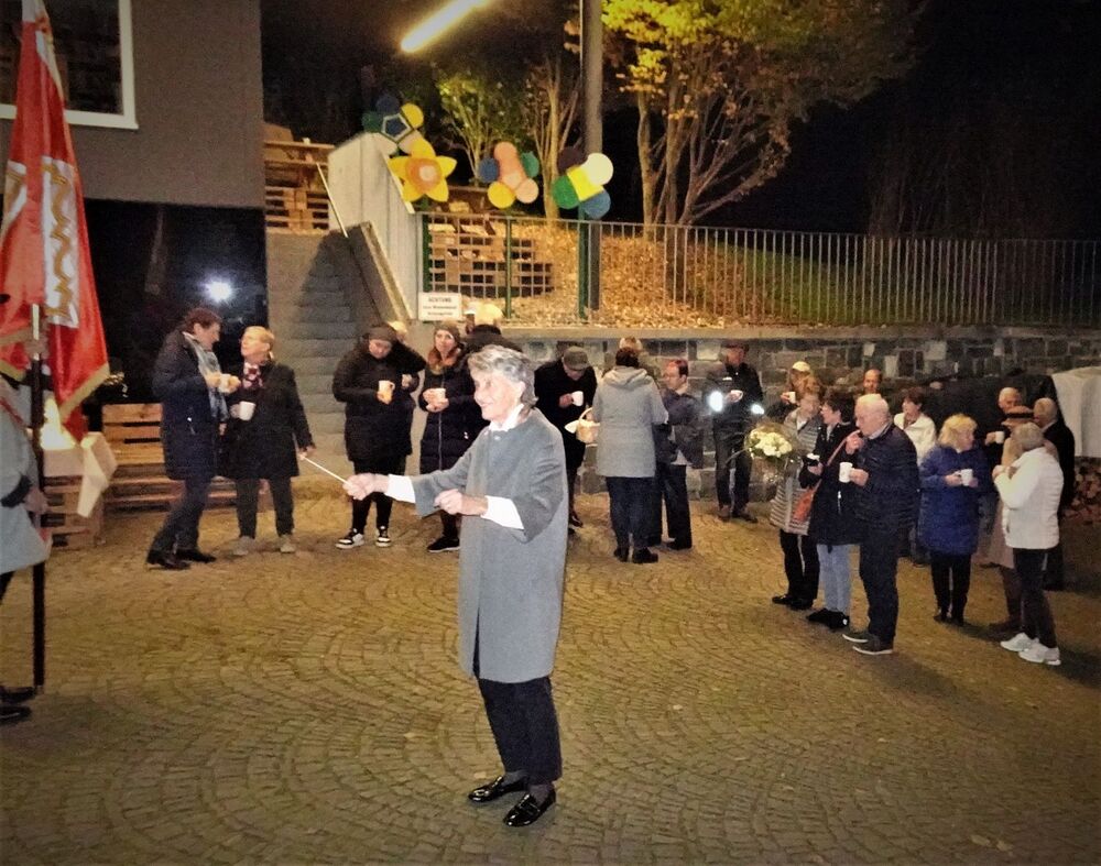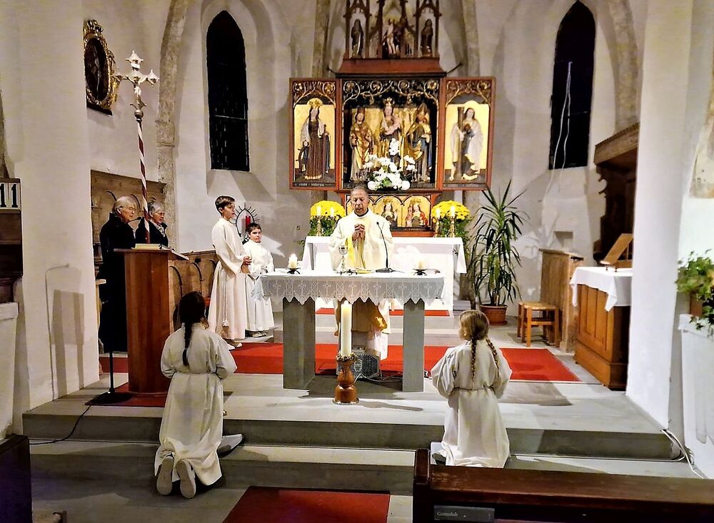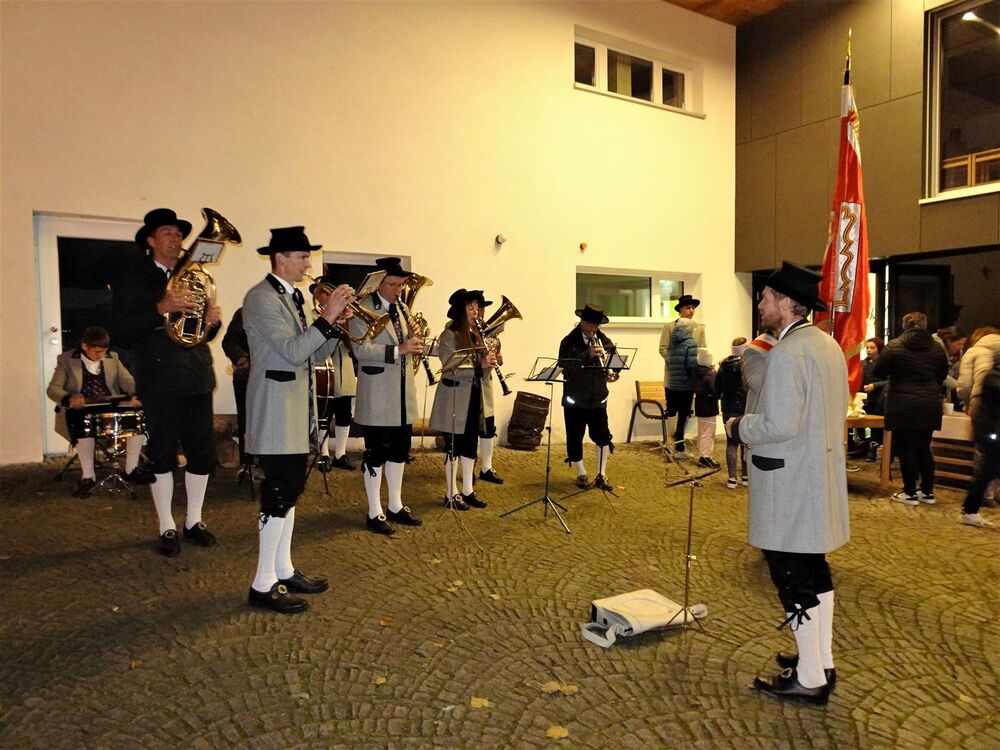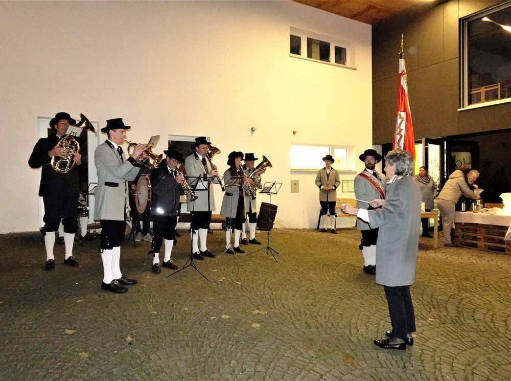 Im Anschluss an den Gottesdienst erfreute der Musikverein die Messebesucher mit einem Ständchen auf dem romantischen Kirchplatz. Traditionsgemäß wurde die Fahnenpatin Gertrud Scherer von Vereinsobmann Andreas Scherer zu ihrem Geburtstag geehrt, den sie am 11. 11. feiert. Bei einem Patrozinium darf natürlich auch der gesellschaftliche Teil nicht zu kurz kommen. Dazu luden Pfarrgemeinderat und Musikverein die Festgäste zu einer Agape mit Glühmost, Tee und Gebäck ein.